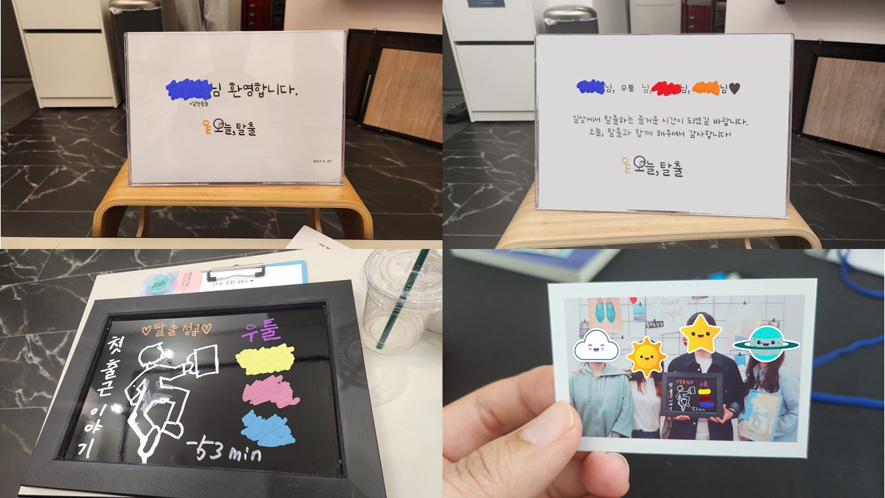 생각해보면 '오늘, 탈출' 이라는 방 탈출을 진행하기 위해서 우리는 예약부터 신경을 썻고, 긴 거리를 오고 가는 노력까지 있었다. 그런데도 그 노력이 아깝다라는 생각이 들지 않고 잘왔다는 생각만 남게 만드는 방 탈출 카페였다.